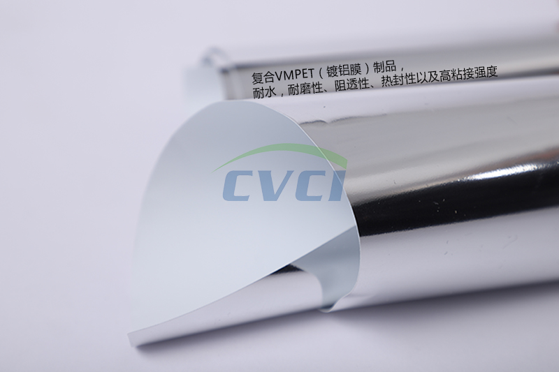 復合VMPET(鍍鋁膜)制品,具有耐水,耐磨性、阻透性、熱封性以及高粘接強度,對紫外和紅外光具有良好反射性等產(chǎn)品特性。阻隔性性能指標為:氧氣透過量cm3/(m2? 24h? 0.1Mpa)≤1.5,水蒸氣透過量(g/m2?24h)≤1.5。